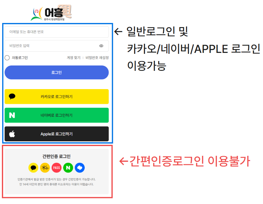 ※ 일반 로그인(아이디/비밀번호)은 정상 이용 가능